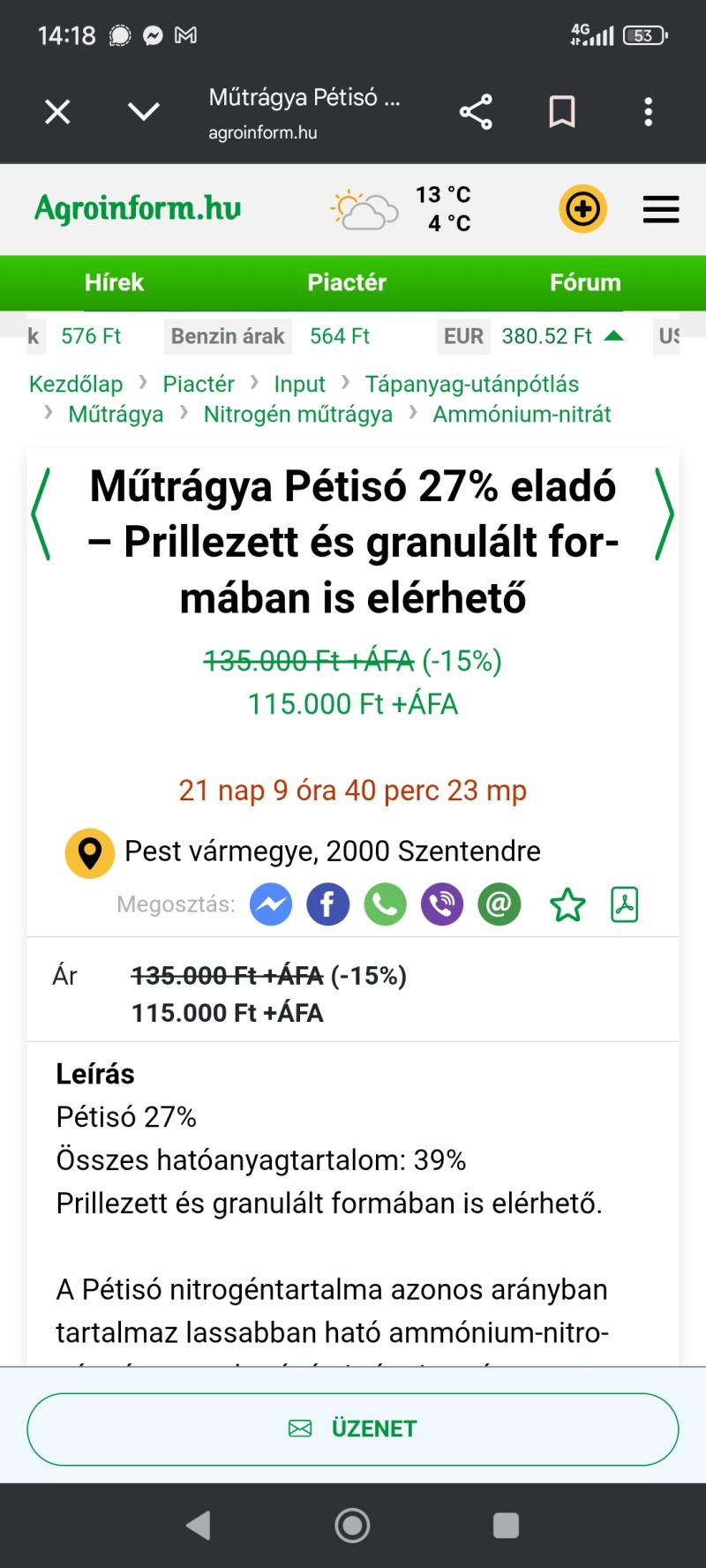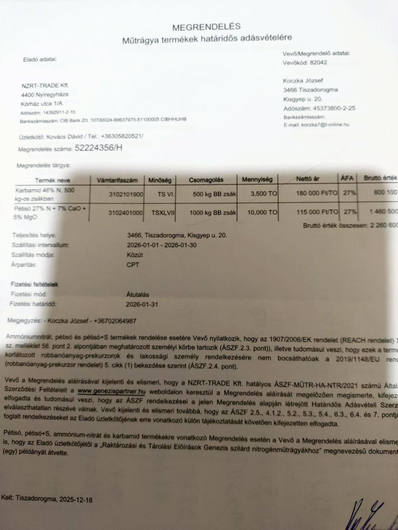 Ma vettem 1 kamionnyi 27 % Dusloi mütrágyát 350 euró/tonna ..... 134 750 Ft/tonna áron, 2026 július 31. fizetéssel.