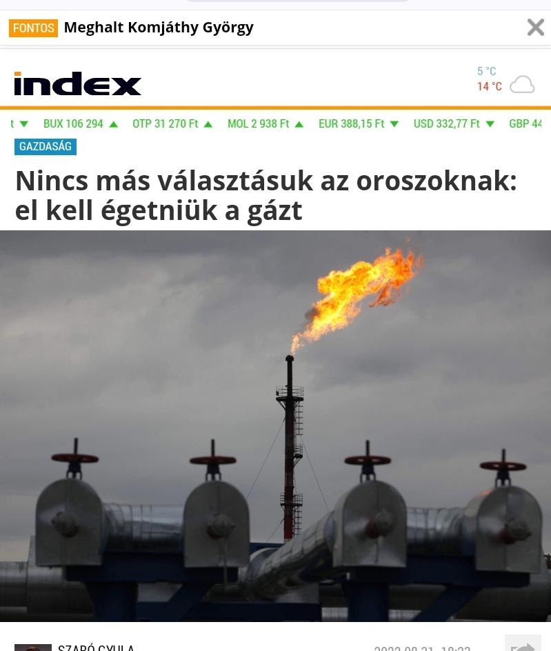 Válasz medikus #5552. hozzászólásáraA háború kitörésekor miért lett többszöröse a gázár? Amikor még az eu sok orosz gázt vett? Mert putyin ugyanolyan olcsón adta, azért lett dràga? Azért állt le középeurópa műtràgyagyártása, mer olcsó volt a gáz? Azért volt hazànkban is 40 ezer forint a műtràgya mert putyin ugyanolyan olcsón adta a gázt? A faszt! Nem adta olcsón, ahogy most sem adja. Azért kerül 7x annyiba a gáz, a rezsicsökkentett szint fölött. És azért arat mindenki erősen, hogy ebben a hónapban befejezze a munkát a szárító, mert utána nem fogják bekapcsolni az égőfejet, akármi is lesz.