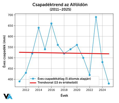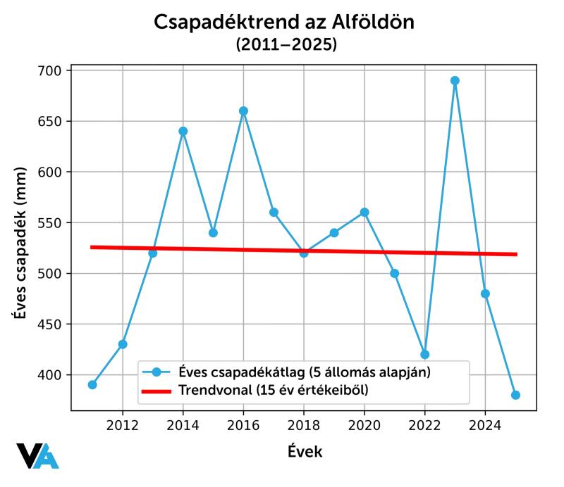 ???? Tizenöt évből tízszer nem érte el az az 550 mm-t – így csökken az éves átlagos csapadék az Alföldön. Új vízpolitikai cikkünkhöz kiszámoltuk legnagyobb tájegységünk éves átlagcsapadékait. A lényeg: évente 7–8 milliméteres csökkenő trend látszik. Vagyis 15 év alatt körülbelül 100–120 mm-es hiány keletkezett. Ez az átlagos szám; a legszárazabb területeken a hiány a 300 mm-t is meghaladja.