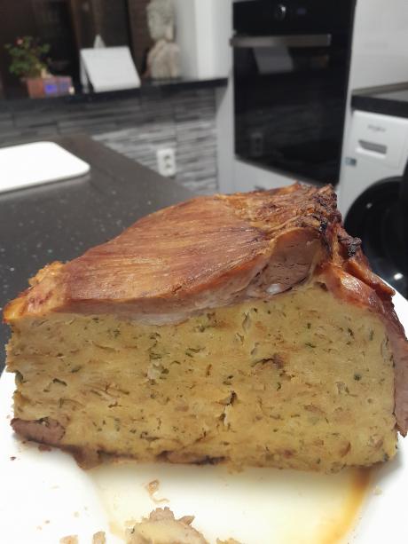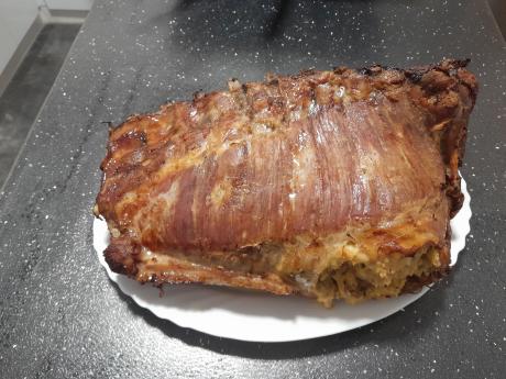 Felénk vagy kolbászhús vagy aprólékos baromfi töltelékkel van kitömve.