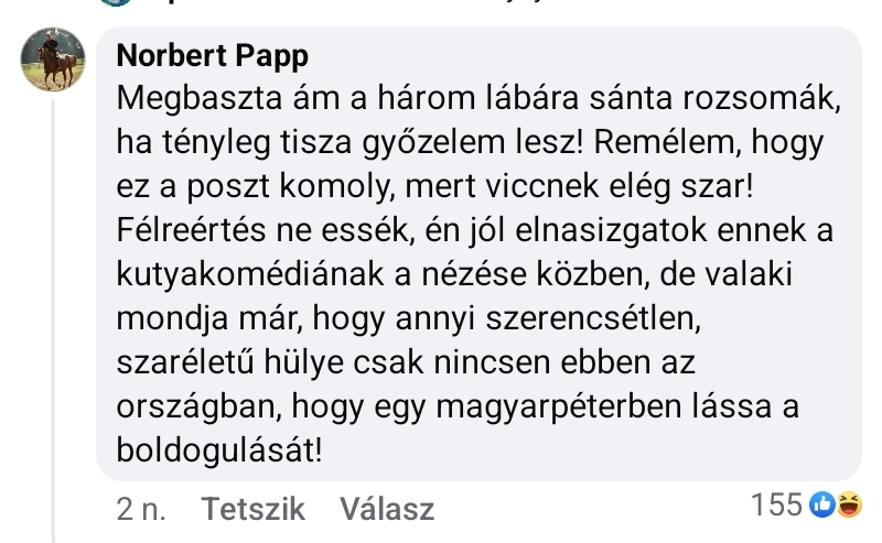 Válasz hashtag #158000. hozzászólásáraTe Bandi, húzd már ki a seggedből a fejed és menj vissza 34 évet az időben és helyezd már kontextusba a történéseket. Tolod a brüsszeli mantrát, mint a bolond tót az anyját.