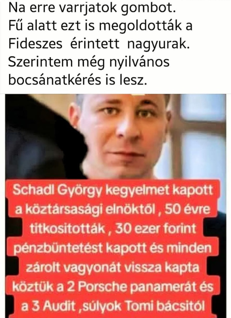 Válasz Igazi Földönfutó #139112. hozzászólásáraMajd a fideszes ügyészség/pintőrség megoldja neked, hogy 30 évig ebből se legyen ügy.