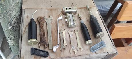 Most már csak azt kellene összeszögelnem, a többi megvan (szerszámok, emelő, termosz, motortakaró, csatlakozók, hézagmérő, olajpumpa 5db, gépkönyvek).