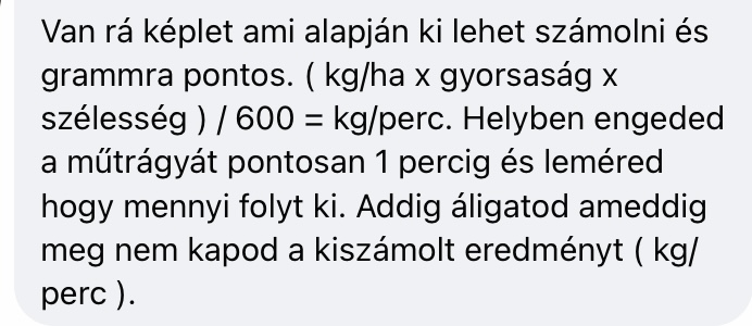 Válasz Ganajos #649. hozzászólásáraNem képlet kell. Idő mérés, tömegmérés, traktor sebesség, munkaszelesseg, aztan lehet szamolni. De úgy is lehet, ahogy írták, valamilyen karállással kiszórsz egy kisebb mennyiséget, aztán abból viszonyitasz. Megmered mekkora területre lett elég, azt átszámolod mennyi lenne 1 hektarra. Ha pontosabbat akarsz akkor stopperral az időt is méred. Ha tudod a traktor sebességet is, akkor azt is lehet szamolni mi van ha ugyanazzal a nyilassal gyorsabban mész, lassabban mész. Kockás papíron meg számolgatsz, kis idő, de kibírhato.