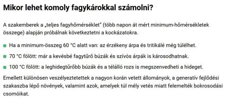 Válasz mtz1221 #7932. hozzászólására Kedves mtz1221! Továbbítottam kolléganőmnek, a cikk írójának észrevételed. Az alábbi választ adta: A cikkben szereplő 60, 70 és 100 °C-os értékek nem a pillanatnyi hőmérsékletet, hanem az úgynevezett összegzett minimum-hőmérsékletet jelentik. Ez egy agrármeteorológiai mutató, amely több egymást követő nap napi minimum-hőmérsékleteinek összegét jelzi – például hat egymást követő -10 °C-os éjszaka összesen -60 °C-ot eredményez. Ezt a mutatót a fagykockázat hosszú távú értékelésére használják, mivel jól tükrözi a hideghatás összesített terhelését a növényállományra. Így segít jobban megérteni, hogy a fagytűrési határértékeket mikor lépheti túl a környezet.